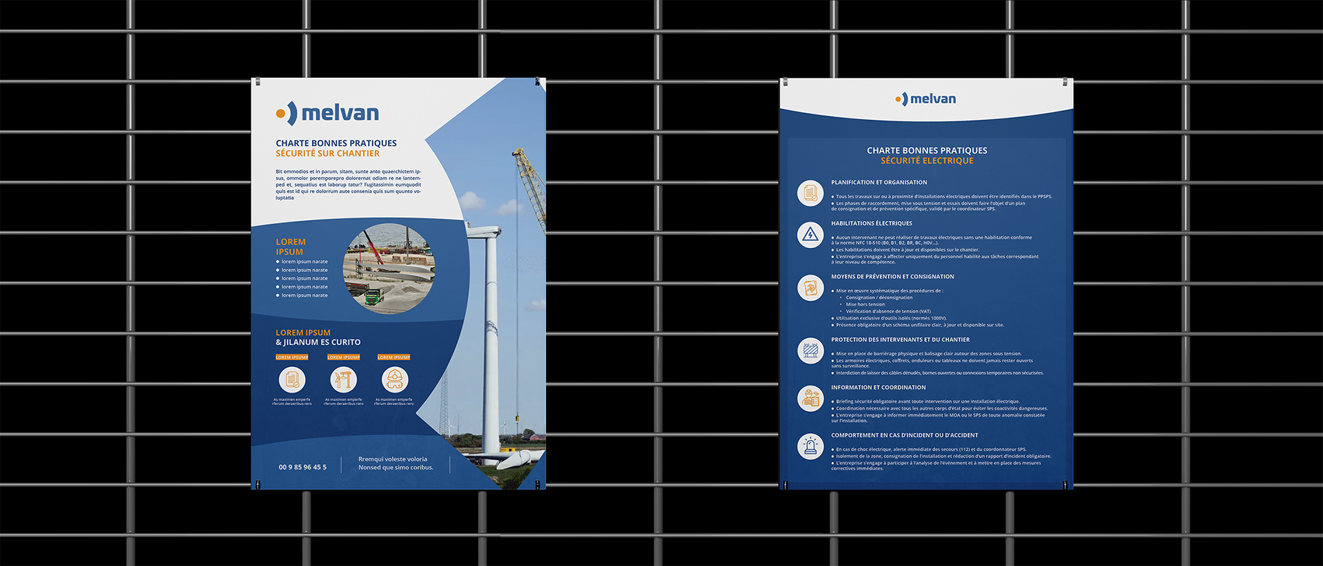 La mission comprend la direction artistique et la conception d’un livret d’onboarding pédagogique, d’une affiche institutionnelle (charte des bonnes pratiques chantier) ainsi que la création d’une trame PowerPoint sur mesure. L’ensemble a été développé dans le respect strict de l’identité visuelle de Melvan, avec un travail approfondi de hiérarchisation de l’information, d’intégration d’illustrations et de pictogrammes vectoriels, et de mise en page claire et engageante.